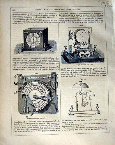 1862 Breguet Instruments Apparatus Morse Inkwriting Seven plates from The International of 1862, or Great London Exposition, was a world's fair. It was held from 1 May to 1 November 1862, beside the gardens of the Royal Horticultural Society, South Kensington, London, England, on a site that now houses museums including the Natural History Museum and the Science Museum (London). Exhibitions included such large pieces of machinery as parts of Charles Babbage's analytical engine, cotton mills, and maritime engines by the firm of Henry Maudslay, as well as a range of smaller goods including fabrics, rugs, sculptures, furniture, plates, silver and glass wares, and wallpaper. The exposition also introduced the use of caoutchouc for rubber production and the Bessemer process for steel manufacture. Size of each plate is 11 x 8.5 inches (280 x 220) Please note these images are black and white but due to camera some may appear to have colour in them. All are genuine antique prints and not modern reproductions.