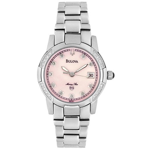 A perfect blend of luxury and sport, this elegant Marine Star watch from Bulova shines with twenty-six sparkling diamonds. The polished steel case highlights a pink mother-of-pearl dial with ten genuine diamond hour markers as well as broad luminous hands and a date display. A Breguet-style seconds hand and traditional seconds ruler add a dash of vintage style. The watch is showcased on an attractive polished steel bracelet that fastens with a deployment buckle. This Bulova watch features precise Japanese quartz movement and is rated water resistant to 30 meters.