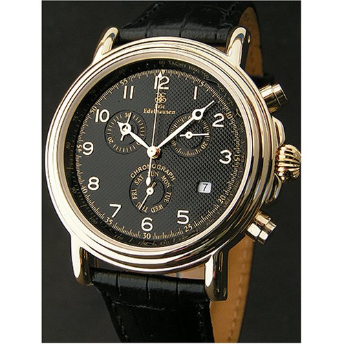 Whether you're on your way to a board meeting, a job interview or a formal dinner, this is the watch to put on your wrist. A classic gents dress watch in a chronograph style. Product description: Case and dial: All 18K gold plated surgical grade 316L stainless steel case with crown protectors. Stainless steel screw down case back. 18K gold plated stainless steel onion style crown and pushers. Measurements: 40mm wide without the crown. 46.6mm lug tip to lug tip. 13mm tall. Water resistant 5ATM (50meters) Black guilloched dial. 6 gold-plated diamond cut hands. Gold Arabic hour indicators. Tachymeter on flange. Scratch resistant crystal. Indications: Hour, minute and 1/5th second chrono hands at center. Date window at 4:00. Sub dials; 30 minute counter at 10:00, permanent 60 second eye at 2:00, day of the week at 6:00. Movement: 3-jewel quartz controlled, gilded, ISA 8172/220 chronograph movement with split time function. Strap: Black 20mm wide genuine leather, padded, hypoallergenic strap with EE logo on underside. All stainless steel 18K gold plated buckle with EE logo. Suitable for wrists up to 8 1/4 inches. All Eric Edelhausen Legacy Timepieces come with a beautiful wood presentation box within a gift box as well as an owners guide, one-year warranty card and a watch travel pouch.