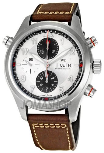 Stainless steel case with a brown calfskin strap with contrast stiching. Stainless steel bezel. Silver dial with silver-tone hands and Arabic numeral hour markers. Minute markers on the outer rim.Luminiscent hands and markers. Day and date aperture at the 3 o'clock position. Chronograph - three sub-dials displaying: 60-second, 30-minute and 12-hour. Self-winding automatic movement. Scratch resistant sapphire crystal. Sc rew down crown. Solid case back. Case diameter: 44mm. Case thickness: 17.1mm. Tang clasp. Water resistant at 60 meters (200 feet). Functions: chronograph, date, day, hour, minute, second. IWC Spitfire Double Chronograph Mens Watch IW371806.