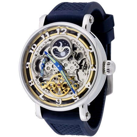 This rich looking Rougois model features a day/night indicator at 12:00, a second time zone sub-dial at 9:00 and fully skeletonized automatic (self-winding) movement. It also features a skeleton bezel with hour markers that appear to be floating in space. The blue colored hands are treated with a luminous material for viewing time in the dark. An onion crown sets the time and looks regal paired with the highly polished stainless steel case. Case: Polished solid stainless steel, 45mm diameter. Band: Silicon rubber strap. 22mm. Water Resistant: 150 feet. Warranty: 1 year.